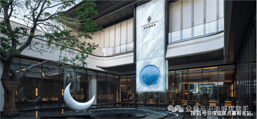 ,是历经数十版方案淬炼出的灵魂之作。御湖境标志性汉白玉玄月族徽,与高10米的蓝水晶奢石光幕,共同演绎“日月同辉”的震撼场景。庭院深处50年乌桕树王矗立。