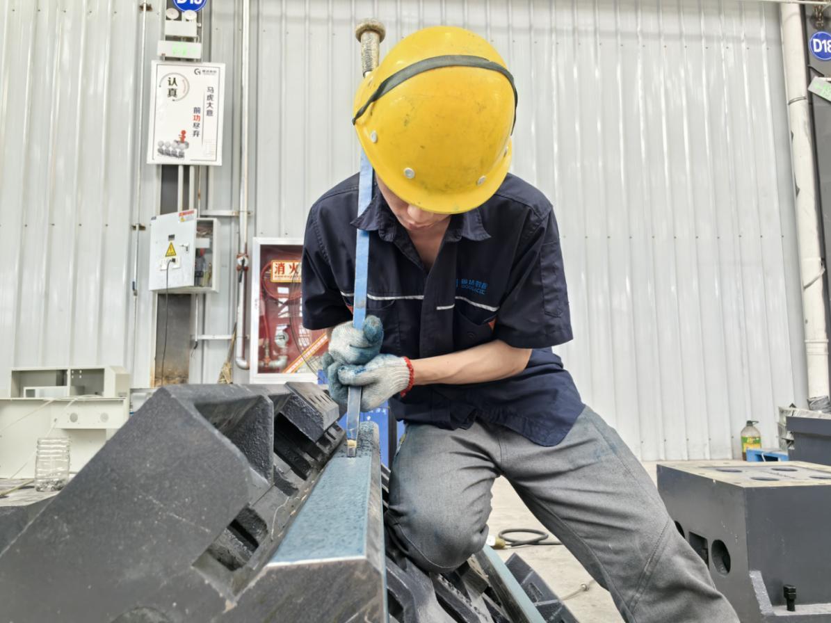 汉中市南郑区的车间里,58 岁的王宝鑫弓着腰,刮刀在机床导轨面游走。“这叫刮研工艺,要让接触面一平方英寸内均匀分布 25 个点,误差控制在 0.005 毫米内。” 老匠人额头渗着汗珠,刀花在金属表面形成细密纹路。他曾在汉川机床厂工作 20 年,如今加入固达数控,“在家门口就能干老本行,踏实。”