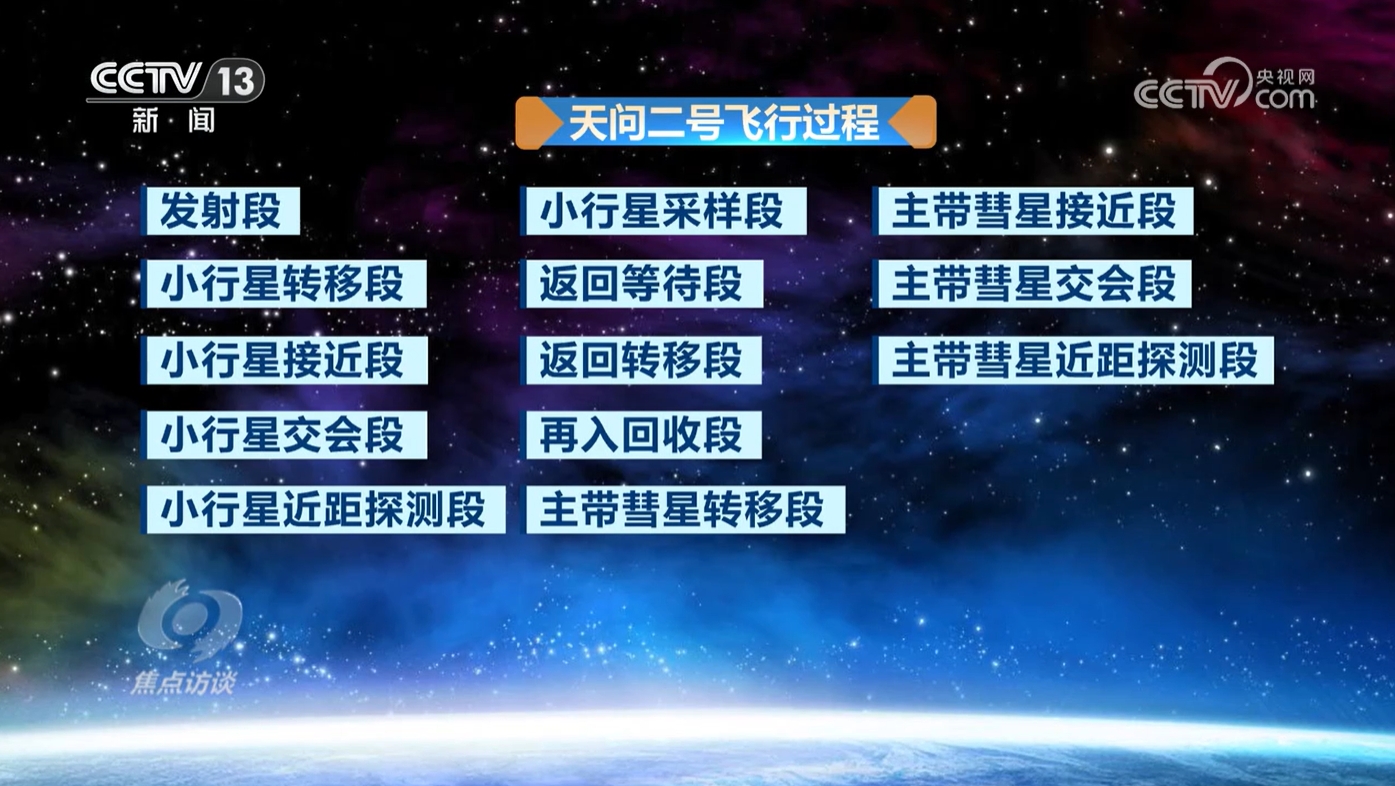 (焦点访谈):5月29日,西昌卫星发射中心,长征三号乙运载火箭搭载着天问二号探测器,在烈焰和轰鸣声中腾空而起,奔赴浩渺的太空,迈出了行星探测工程的重要一步。天问二号此行肩负着两大艰巨而光荣的使命:首先要对小行星2016HO3展开全方位探测,并采集珍贵样本,用返回舱送回地球;随后主探测器还要继续马不停蹄奔赴主带彗星311P,开展深度科学探测。我们为什么要去探访遥远的小行星和主带彗星?这趟深空探索之旅难度有多大,将为人类文明发展带来哪些深远影响?天问此去,什么时候能够回来?