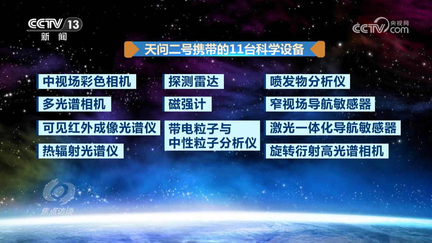 天问二号探测器上共配置了中视场彩色相机、多光谱相机、可见红外成像光谱仪、热辐射光谱仪等11台科学设备,这些先进设备将助力探测器在飞行过程中对小行星和主带彗星进行探测,获取科学数据。