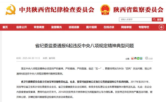 近日,陕西省卫生健康委员会原主任刘宝琴违规收受礼品、礼金,接受可能影响公正执行公务的宴请和公车私用问题被通报。
