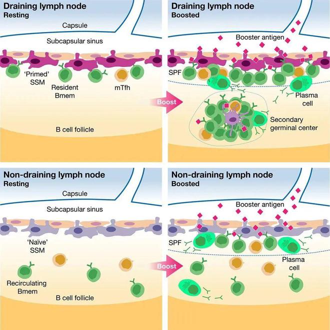 研究发现,巨噬细胞在淋巴结内“启动”,指导记忆B细胞的定位,从而在同一只手臂上给予增强剂时更有效地反应。