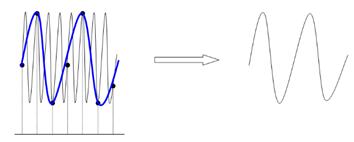 采样率严重不够会导致混叠,信号本来是左图中黑线表示的正弦波,测量到的信号也仍然是正弦波,但频率发生了改变。
