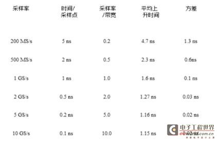 那么在示波器的使用上,到底该如何选择采样率呢?一个原则就是:感兴趣的信号上升沿能采样3-5个点。上升沿能采样最少有3个点,达到5个点就足够了,采样更多的样本点意义也并不大,如表所示对于上升时间为1ns的信号,如果上升沿采样5个点,也就是每间隔0.2ns采样一个点,采样率需要5GSa/s以上,表中可以看出当采样率为5GSa/s和10GSa/s时,测量上升时间的统计平均结果是一样的,方差值都是0.02ns。