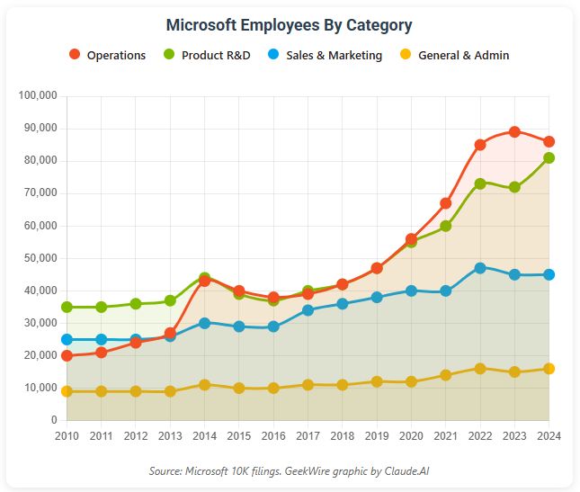2010–2023年微软不同部门员工变化。运营与研发人数暴涨,而行政和市场岗位几乎停滞。组织结构的「哑铃化」趋势愈发明显。