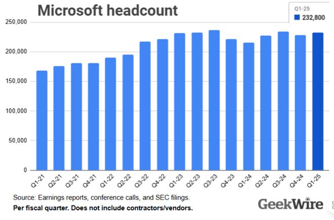2021–2025财年微软员工总数变化。AI扩张期带来用工高峰,但在2023年后进入重组阶段,员工规模虽未剧减,结构已被彻底重写。