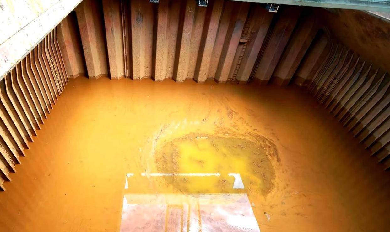 一艘5万吨级的货船,即便含水量被控制在34%,也意味着它的货舱里混着高达1.7万吨的水。 这些水并非聚集在一处,而是均匀地混杂在数亿吨细小的矿粉颗粒之间。 在静止状态下,它看起来是稳定的固体。
