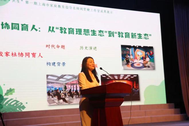 上海市家庭教育指导名师周雯婕工作室主持人、卢湾高级中学书记周雯婕老师,以《探索协同机制构建,擘画育人生态蓝图》为题,分享了工作室在实践中的智慧和经验。她深入解析了如何以学校为核心纽带,充分调动和激活家庭与社会在教育方面的巨大潜能,共同构建一个更加完善的育人生态系统。“教育是一场温暖的相遇,是家庭、学校与社会用爱与智慧共同编织的成长诗篇。今日的相聚,不仅是一次成果的展示,更是一场心灵的共鸣——我们见证了‘唤醒’的力量,感受了‘联结’的温度,也触摸到‘共生’的可能。校家社协同育人,我们永远在路上。”